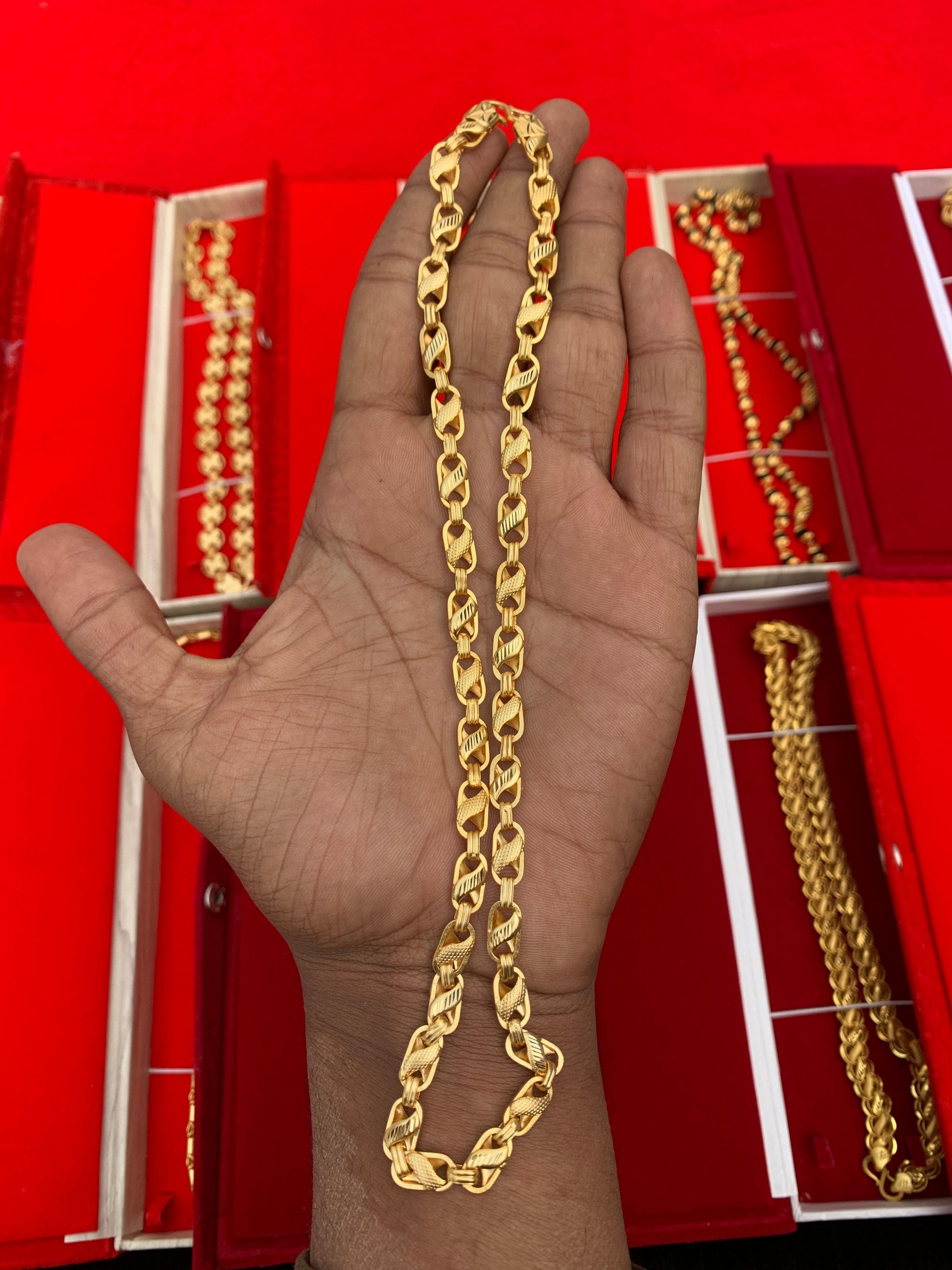 MATERIAL:- BRASS, COLOUER:- GOLD, 24 LONG INCH CHAIN, S LOCK DESIGN, PLZ AVOID CHEMICAL,PERFUMES...ETC